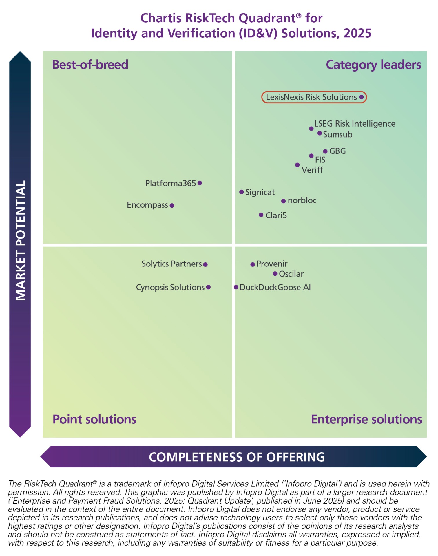 O estudo analisou 42 fornecedores globais de soluções contra fraudes corporativas e de pagamento, com base em dois critérios principais: integridade da oferta e potencial de mercado. A LexisNexis Risk Solutions se destacou, alcançando o mais alto posicionamento em todas as quatro categorias.